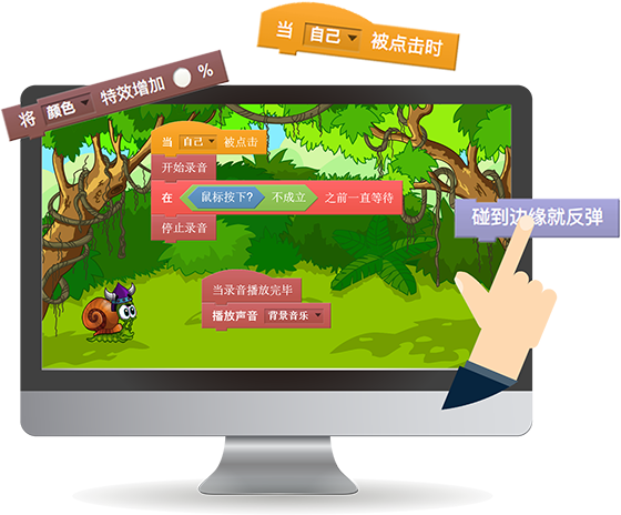 酷拼H5的每一块编程积木都是自然语言说明的功能块,例如、