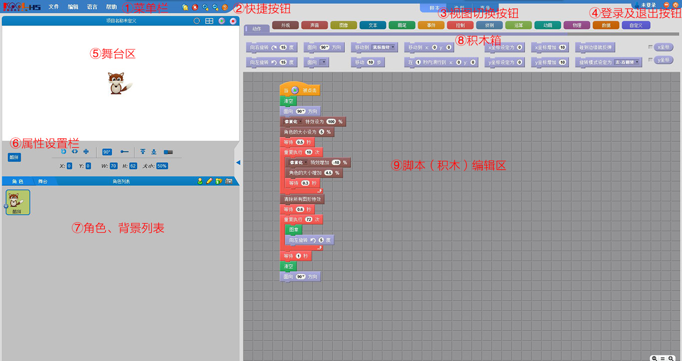 酷拼制作H5工具也定义了一个舞台,用户可以自由选择、设置舞台的背景、添加舞台上的角色和相应的图片素材、音频素材;同时通过 “编程积木”来控制角色行为、 角色之间的交互方式、场景的切换;定义不同的操作控制功能。