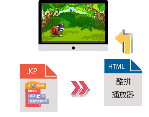 使用浏览器打开H5项目文件时,浏览器自动下载和运行酷拼播放器,并由播放器读取文件中所保存的素材内容、“舞台”和“角色”定义、 “编程积木”及其拼接关系等信息。